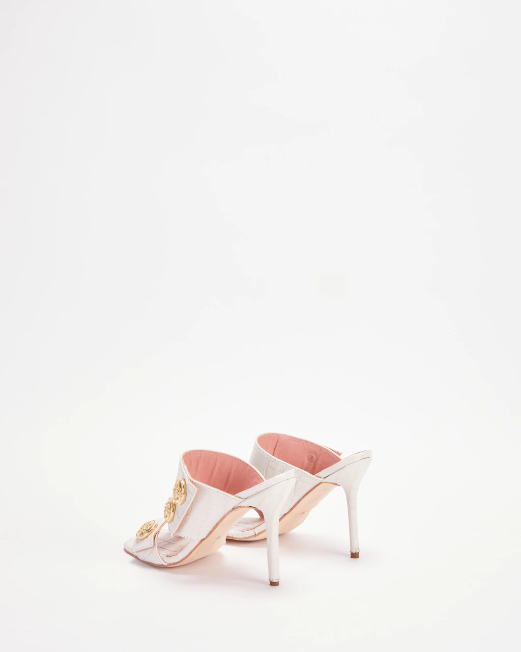 Sandalia confeccioanda en cuero croco natural. Su forro interno, su plantilla y su suelin también son vacunos. La sandalia Hazel tiene un taco de 9 cm.